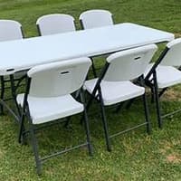 Create the perfect setup for outdoor gatherings, events, or family picnics with these folding chairs. Designed for convenience and strength, it’s ideal for both indoor and outdoor use. Key Features: Durable Build: Made with strong black metal frames and high‑quality white plastic seats, backs, and tabletop. Comfortable Seating: Ergonomic chair design ensures comfort during long events. Portable & Compact: Chairs fold flat for easy transport and storage. Versatile Use: Perfect for parties, camping, church gatherings, catering, or backyard events. Easy Setup: Lightweight design allows quick unfolding and arrangement in minutes. Perfect For: Outdoor picnics, weddings, community events, camping trips, or as extra seating at home.